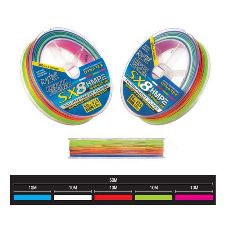 Rapture SX 8 Depth Finder Mulicolor Braid je sastavljen upredanjem 8 visokomodularnih HMPE niti preplitanjem. Karakteriše ga izuzetna mekoća kao i visoka osetljivost. Takođe ima okrugli poprečni presek i odlične je glatkoće. Pogodan je za sve vremenske uslove kao i za slatku i slanu vodu.